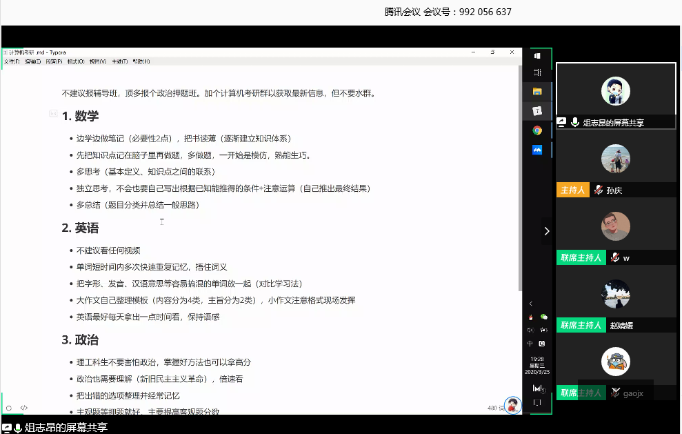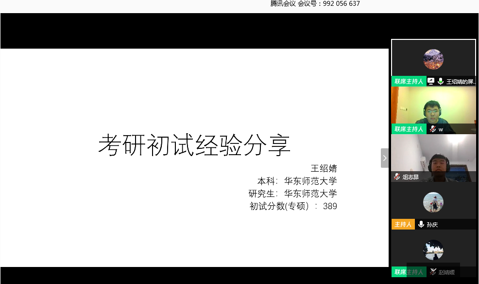 在考研经验分享环节中,19级研究生俎志昂、王绍婧和复旦大学19级硕士研究生高吉祥分别就如何高效获取考研信息和考研复试准备中的注意事项,与同学们分享了各自的经验心得。三位同学不仅给大家推荐了考研复习资料,而且还分享了自己在考研各个阶段的心路历程,给迷茫中的备考大军们指明了方向。