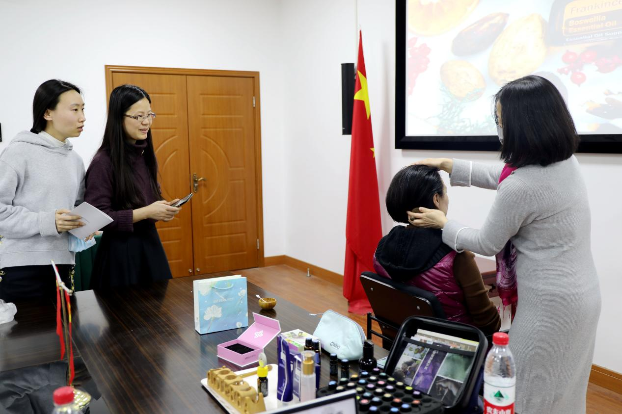 讲座一开始,为了让大家能更加直观的了解各种精油的功效,薛晓红老师拿出不同种类的精油让大家闻气味和轮流体验,与此同时,薛老师还介绍了精油的几种理疗方法。大家边听讲解,边体验精油散发之后带来的缓解疲劳和释放压力的功效,针对老师们出现的睡眠和易疲劳的问题,薛晓红老师现场教授大家使用精油做头部按摩和肩颈按摩的方法,韩璐老师和王晓玲老师纷纷受邀参加了精油理疗活动。