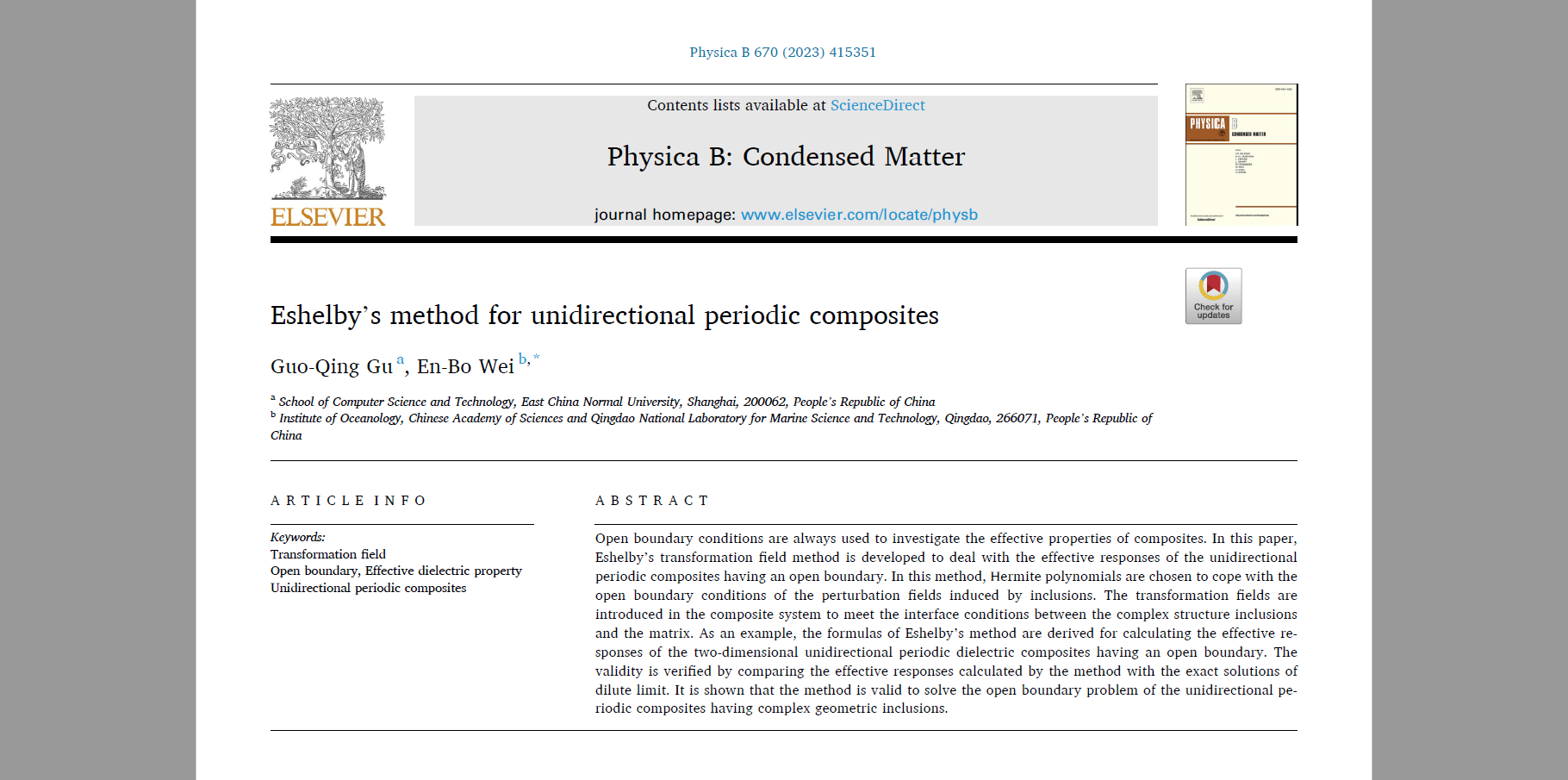 开放边界条件通常用于研究复合材料的有效性能。该项工作发展了Eshelby变换场方法处理具有开放边界的单向周期复合材料的有效响应。在该方法中,选择厄密多项式来处理开放边界条件下复合介质内的场分布。在复合介质系统中引入了变换场,以满足复杂结构杂质与基质之间的界面条件。刚发表的论文是开放边界条件下Eshelby方法的第一篇论文,导出了具有开放边界的二维单向周期复合介质电介质有效响应的相关严格解析公式。通过将该方法计算的有效响应与稀释极限的精确解进行比较,表明该方法的有效性。论文的结果表明,Eshelby方法也适用于在开放边界下处理含任意杂质的复合介质问题。
