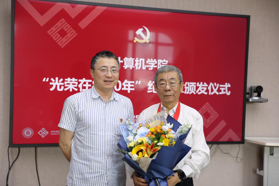 6月25日上午,91直播 党委在理科大楼B504会议室举行简朴而隆重的纪念章颁发仪式。院党委书记余佳为顾君忠教授佩戴“光荣在党50年”纪念章并献上鲜花,并向他致以诚挚问候与美好祝愿。交流中,余佳向顾君忠老师通报了学院首次党员大会召开情况暨近期发展情况,衷心感谢他为学院建设发展作出的重要贡献。顾君忠老师深情回顾入党以来的奋斗历程,对学院近年发展取得的成绩倍感欣慰,他表示将始终牢记初心使命,继续为计算机学科发展贡献力量。